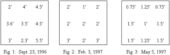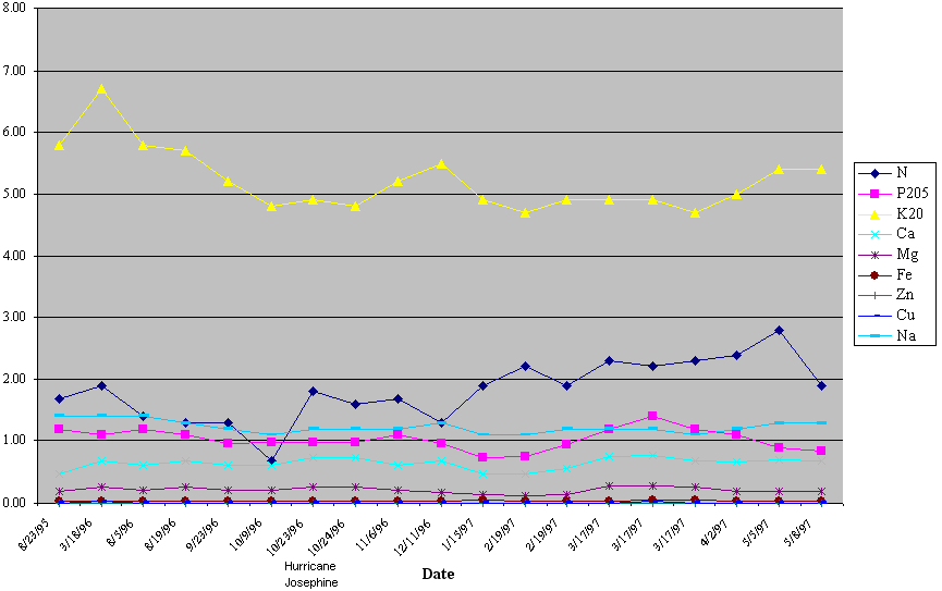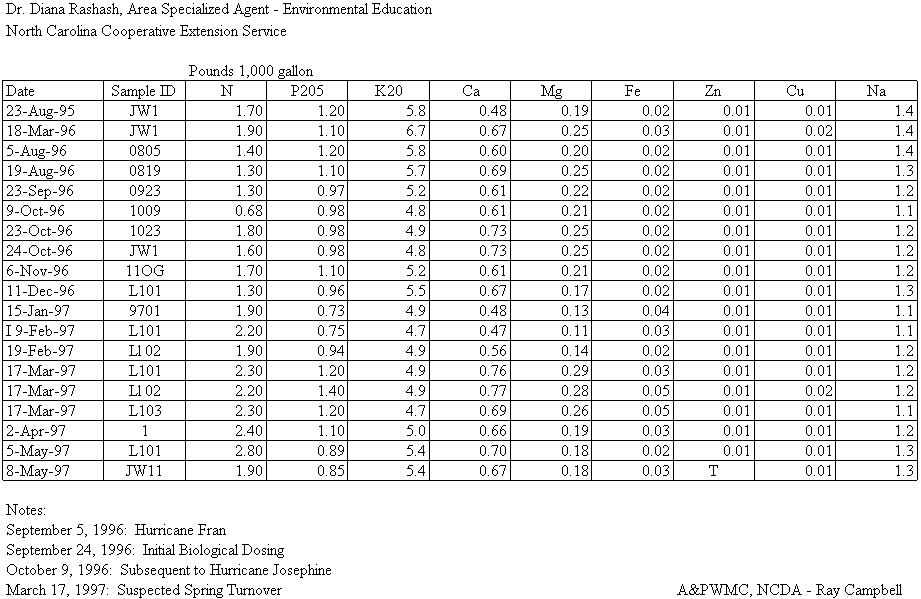 The concentrations of the micronutrients (copper and zinc) in the lagoon liquid remained fairly steady except for the spike that occurred in both the March 17, 1997 and March 18, 1996 samples. It is likely that the concentration spikes indicate seasonal turnover within the lagoon. The phosphorus results indicate a somewhat decreasing concentration trend until the suspected lagoon turnover date, whereas the potassium concentrations showed a continued decreasing or possibly cyclic trend. The nitrogen concentrations did not indicate any trend until January. The results from the latest sample dates indicate that the nitrogen concentrations may be decreasing again now that the weather is warming and the lagoon is restratifying. Ammonia concentrations in the lagoon liquid increased during the project, but the increase may be seasonally related.