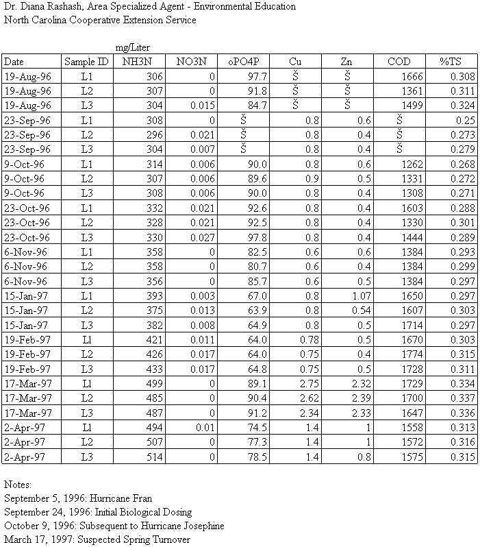 The lagoon for an 1800 hog feeder-to-finish operation was treated for seven months with a bacteria additive. Between September 23, 1996 and February 3, 1997, the mean sludge depth decreased from an average depth of 3.5 feet (range 2 to 5.5 feet) to an average depth of 2.1 feet (range 1 to 3 feet). The sludge depth decreased further to approximately 1.5 feet by March 17th and to 1.22 feet (range 0.75 to 1.5 feet) by May 5th. The concentrations of the micronutrients (copper and zinc) in the lagoon liquid remained fairly steady except for the spike that occurred in both the March 17, 1997 and March 18, 1996 samples. The concentration spikes may indicate seasonal turnover within the lagoon. The phosphorus results indicate a somewhat decreasing concentration trend until the suspected lagoon turnover date, whereas the potassium concentrations showed a continued decreasing or possibly cyclic trend. The nitrogen concentrations did not indicate any trend until January. The results from the latest sample dates indicate that the nitrogen concentrations may be decreasing again now that the weather is warming and the lagoon is restratifying. Ammonia concentrations in the lagoon liquid increased during the project, but the in crease may be seasonally related.