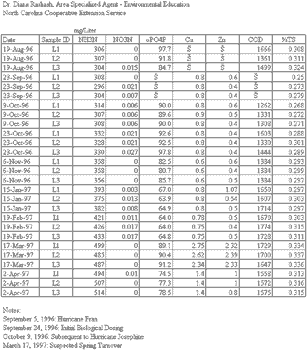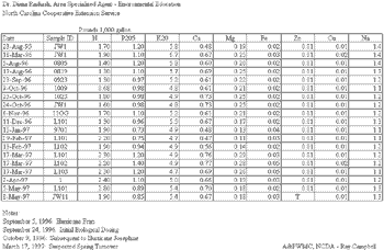 Measurements: Lagoon liquid samples were collected and sent to the North Carolina State University Biological and Agricultural Engineering (BAE) laboratory, the North Carolina Department of Agriculture (NCDA) laboratory, and the Duke University olfactory laboratory. Cotton swatches, which had been left for one hour at specific locations around th e lagoon and within each swine house, were also sent to the Duke University olfactory laboratory. Ammonia concentrations within the swine houses were determined using Drager tubes.