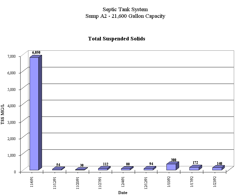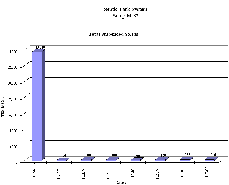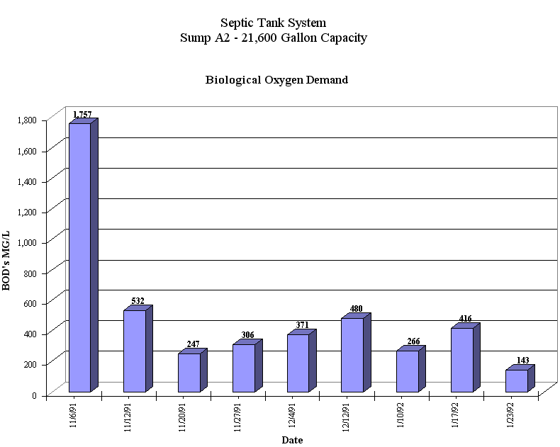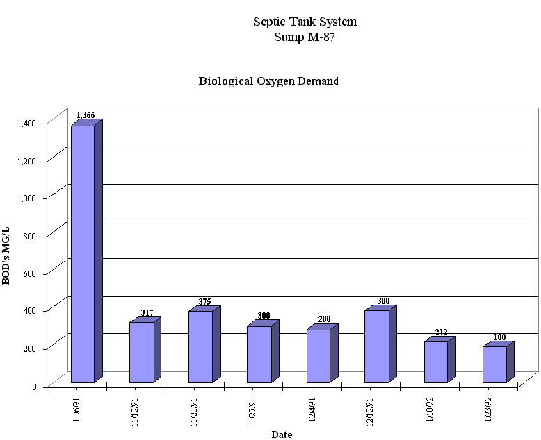 As the graphs indicate, biocatalytic treatment began in the septic tank system on November 6, 1991. Samples were taken from the treated tanks weekly thereafter, except for the period December 12, 1991 to January 3, 1992. Security at this defense installation is stringent and the holidays intervened to prevent unaccompanied and/or unbadged personnel from visiting the treatment sites.