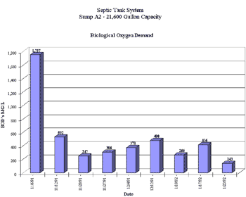 Graphs on the following pages demonstrate the bio-remediation of a septic tank system, which had ceased to operate and was brought into substantial EPA compliance and odors gone within eight days of infusion of biocatalytic agents. The system was stabilized within 60 days while digestion of accumulated solids progressed. Anticipated length for total digestion was an additional 90-120 days with treatment moving to maintenance infusion at that time.