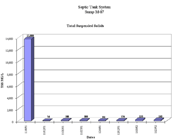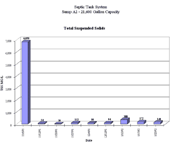 All samples were analyzed for critical indices by a third party, the city sewage treatment plant laboratory. A lab technician certified results. Numbers are reflected in the graphs that follow. They show that within eight days of beginning the treatment process indices for total suspended solids and biological oxygen d emand dropped dramatically and the system was, with marginal exceptions, in compliance with EPA requirements.